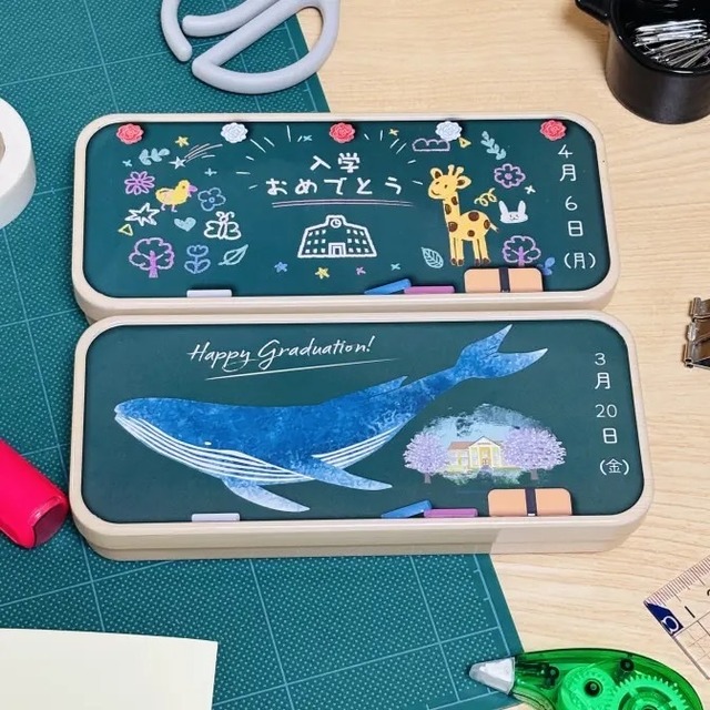 税込価格 680円 ケース入数 12 内容量 38g 原産国 日本 JAN 4573279475368 賞味期限 12ヶ月(製造日起算) 商品サイズ W185×H80×D30(mm) ケースサイズ W245×H195×D130(mm) 新作です✨人気の学校シリーズです! 卒業式の黒板アートをデザインした缶です。 ”大海に出る”出発をイメージして、クジラが大胆に描かれたデザインになっています。 中にはチョークを模したキャンディが赤×1本・白×1本入っています。 入学式バージョンもございます。 *商品写真はできる限り実物の色に近づけるようにしておりますが、撮影状況や光の当たり具合、ご覧になる環境(PCのモニタやスマホの画面)などにより、 実際の商品と色味が異なる場合がございますのでご了承ください。