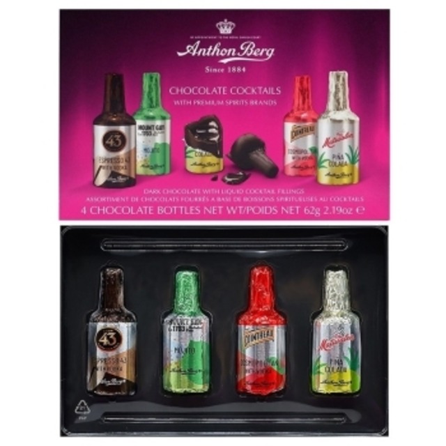 説明 世界の銘酒を使ったカクテル入りダークチョコレート4個/箱。 【内容量】 エスプレッソ43:1個 ピニャ・コラーダ:1個 モヒート:1個 コスモポリタン:1個 ※写真はイメージです。実物とは異なる場合がございます。 ※パッケージ・画像は予告なく変更する場合がございます。 ※商品表示の記載内容につきましては、お手元に届きました商品の表示をご確認頂けますようお願い致します。 ※アレルギー表示およびアルコール分については、パッケージの裏面画像をご確認頂けますようお願い致します。 5774540825304