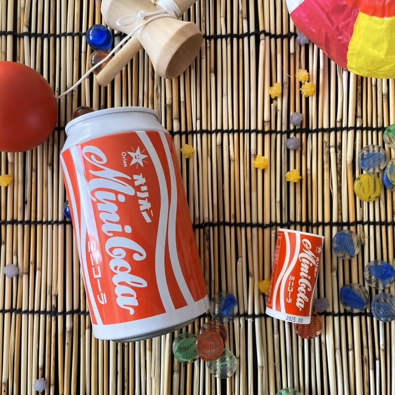缶の中にはオリオンのミニコーラとキャンディが入っています。