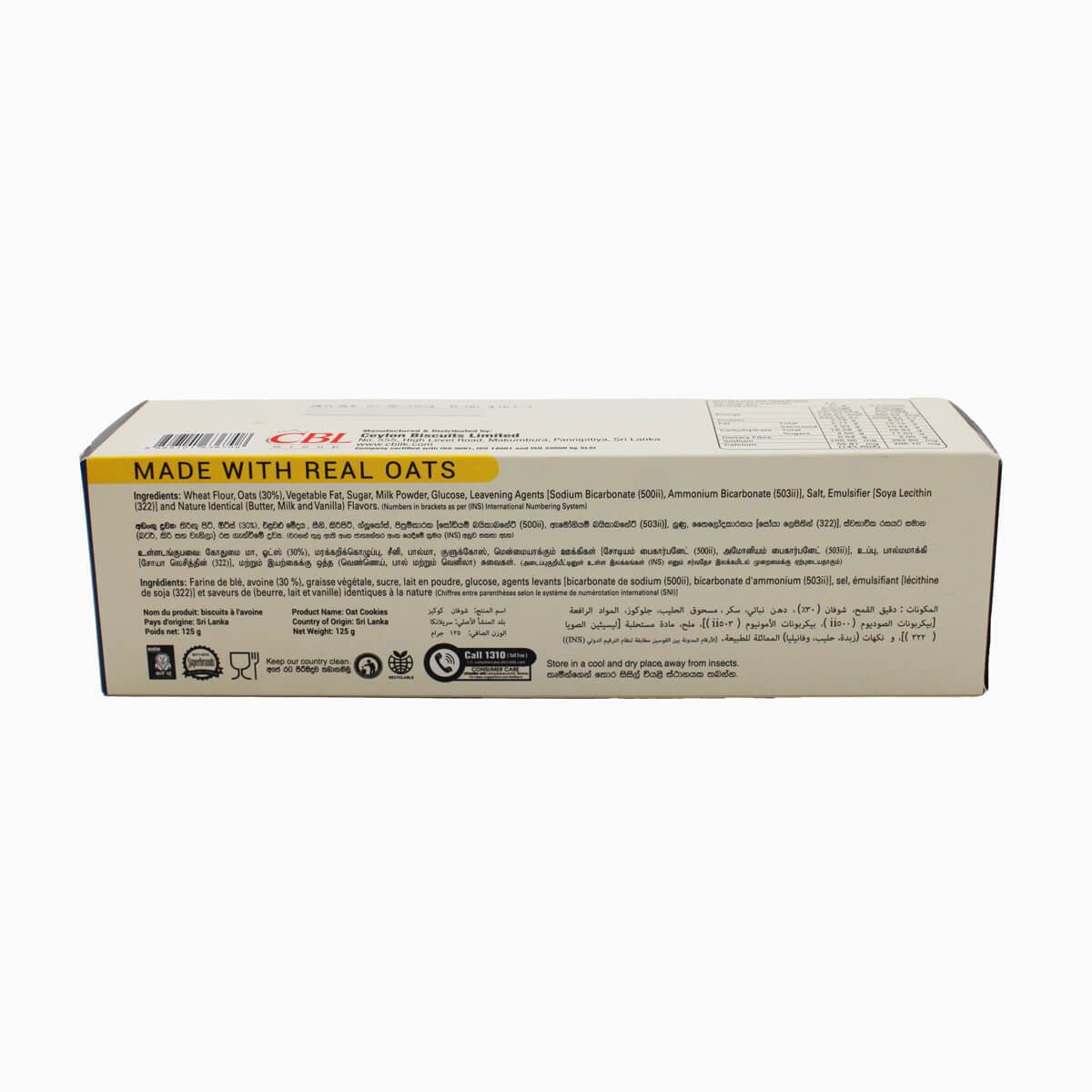 原材料名:小麦粉、オーツ麦、植物油脂、砂糖、全粉乳、ぶどう糖、食塩/膨張剤、乳化剤、香料 (一部に小 麦・乳成分・大豆を含む)