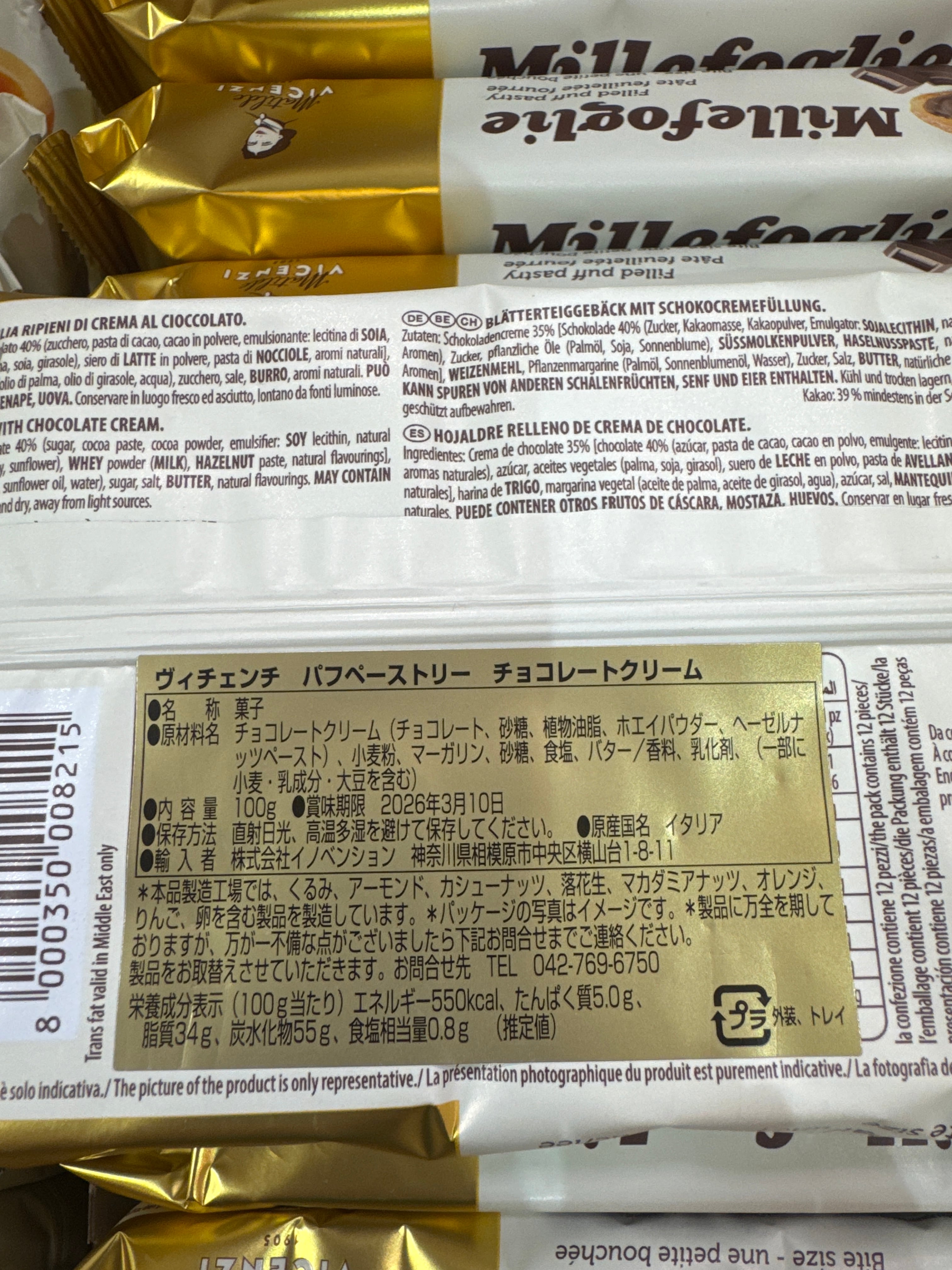 原材料 チョコレートクリーム(チョコレート、砂糖、植物油脂、ホエイパウダー、ヘーゼルナッツペースト)、小麦粉、マーガリン、砂糖、食塩、バター/香料、乳化剤、(一部に小麦・乳成分・大豆を含む)