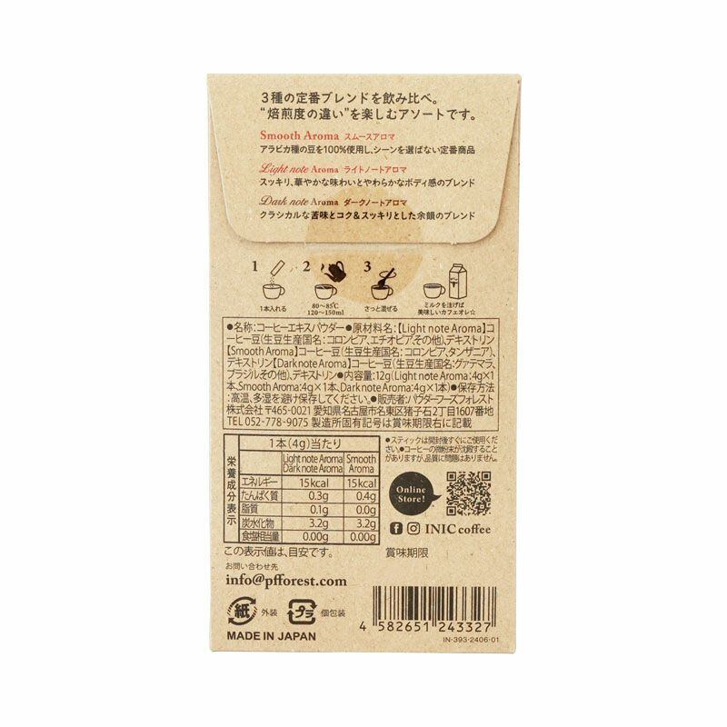 そんなスムースアロマの特徴はそのままに、浅煎りのライトノートアロマと深煎りのダークノートアロマの合計3種のアソートです。