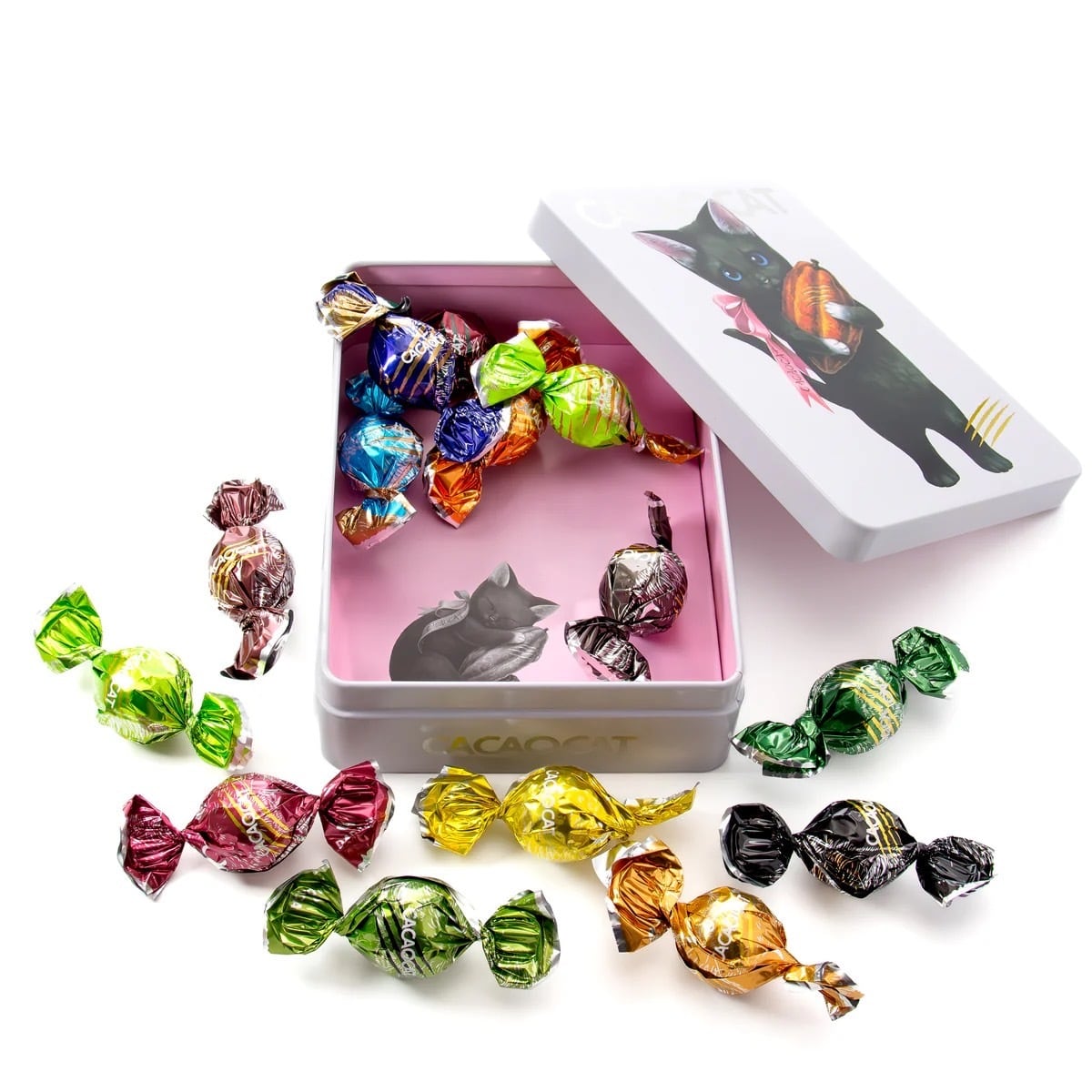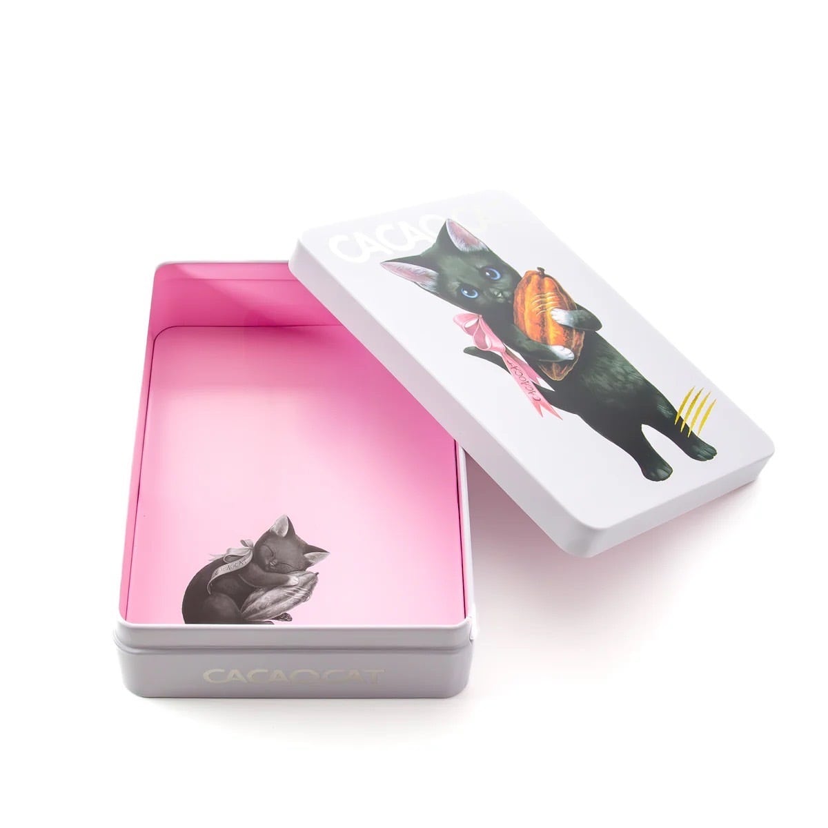 カカオポッドを持った猫のイラストが特徴的なCACAOCAT缶。