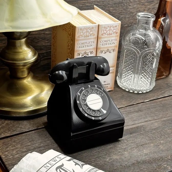 懐かしい黒電話の形の缶です。貯金箱としてもお使い頂けます。
