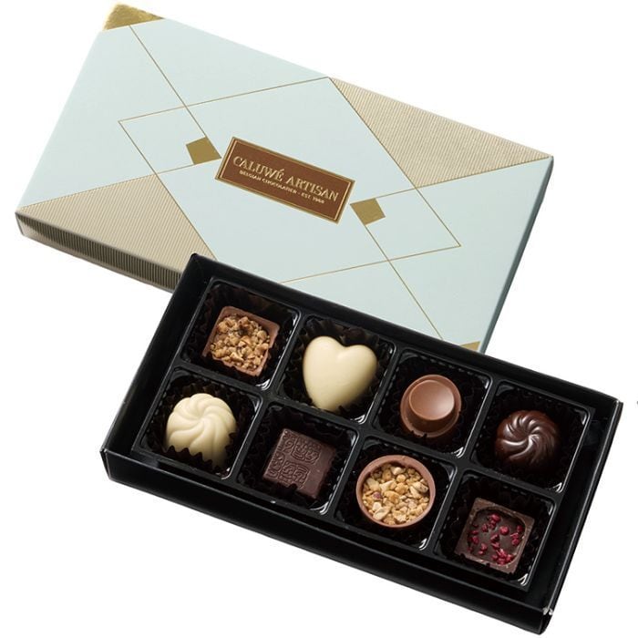 3代続く伝統製法で作られたプラリネショコラとキャラメルフィリングのアソート8粒入り。