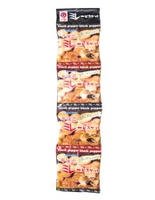 原材料名:ビスケット生地(小麦粉、砂糖、ショートニング、ブドウ糖、食塩)、植物油、ブラックペッパー風味シーズニング(香辛料、食塩、砂糖、蛋白加水分解物)/膨張剤、調味料(アミノ酸等)、香辛料抽出物、乳化剤(大豆由来)、香料、酸味料