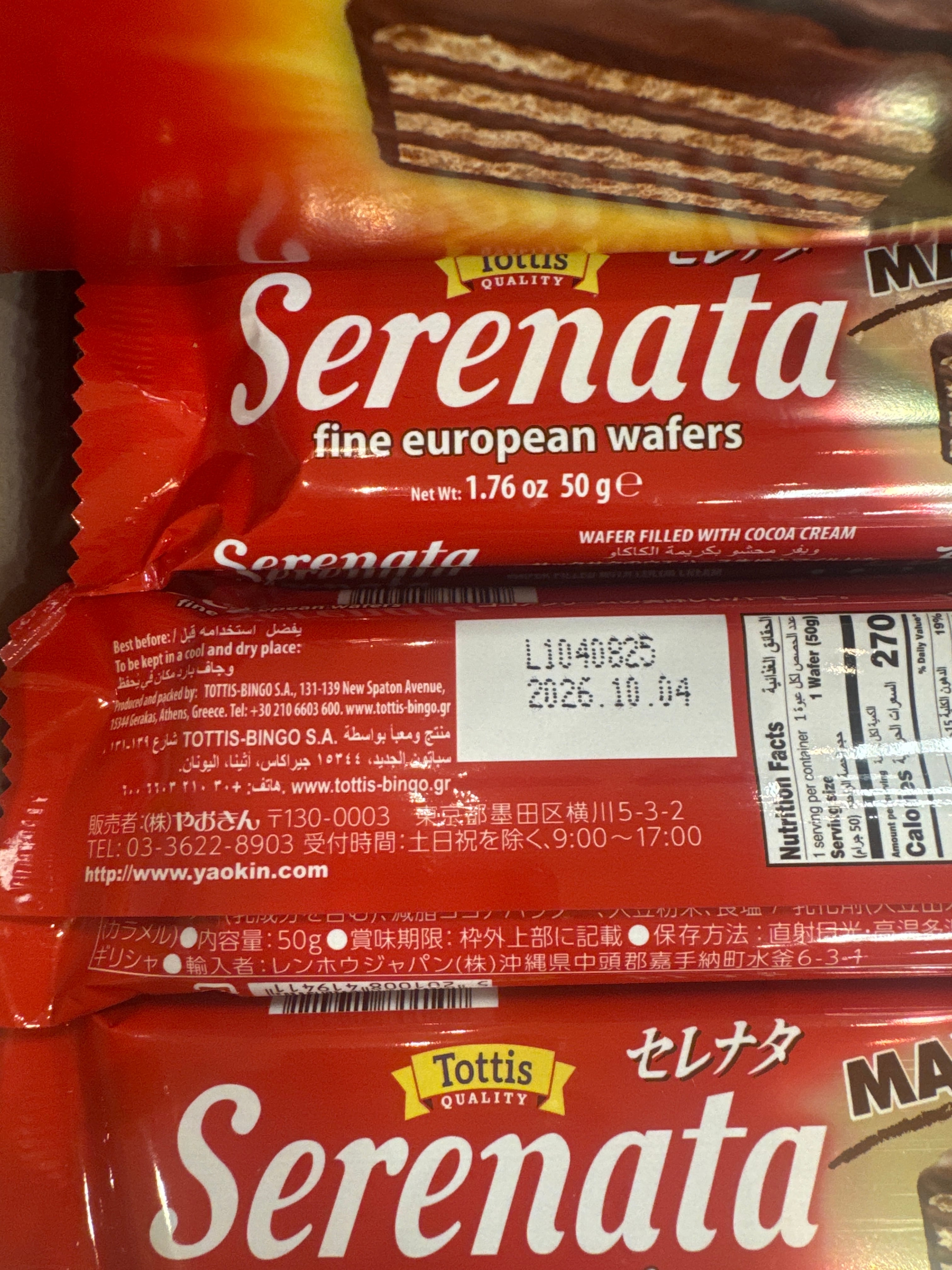 原材料 ココアクリームフィリング(砂糖、植物油脂、ホエイパウダー(乳成分を含む)、減脂ココアパウダー)、小麦粉、砂糖、植物油脂、ホエイパウダー(乳成分を含む)、減脂ココアパウダー、大豆粉末、食塩/乳化剤(大豆由来)、膨張剤、ゲル化剤(コーンスターチ)、香料、着色料(カラメル)