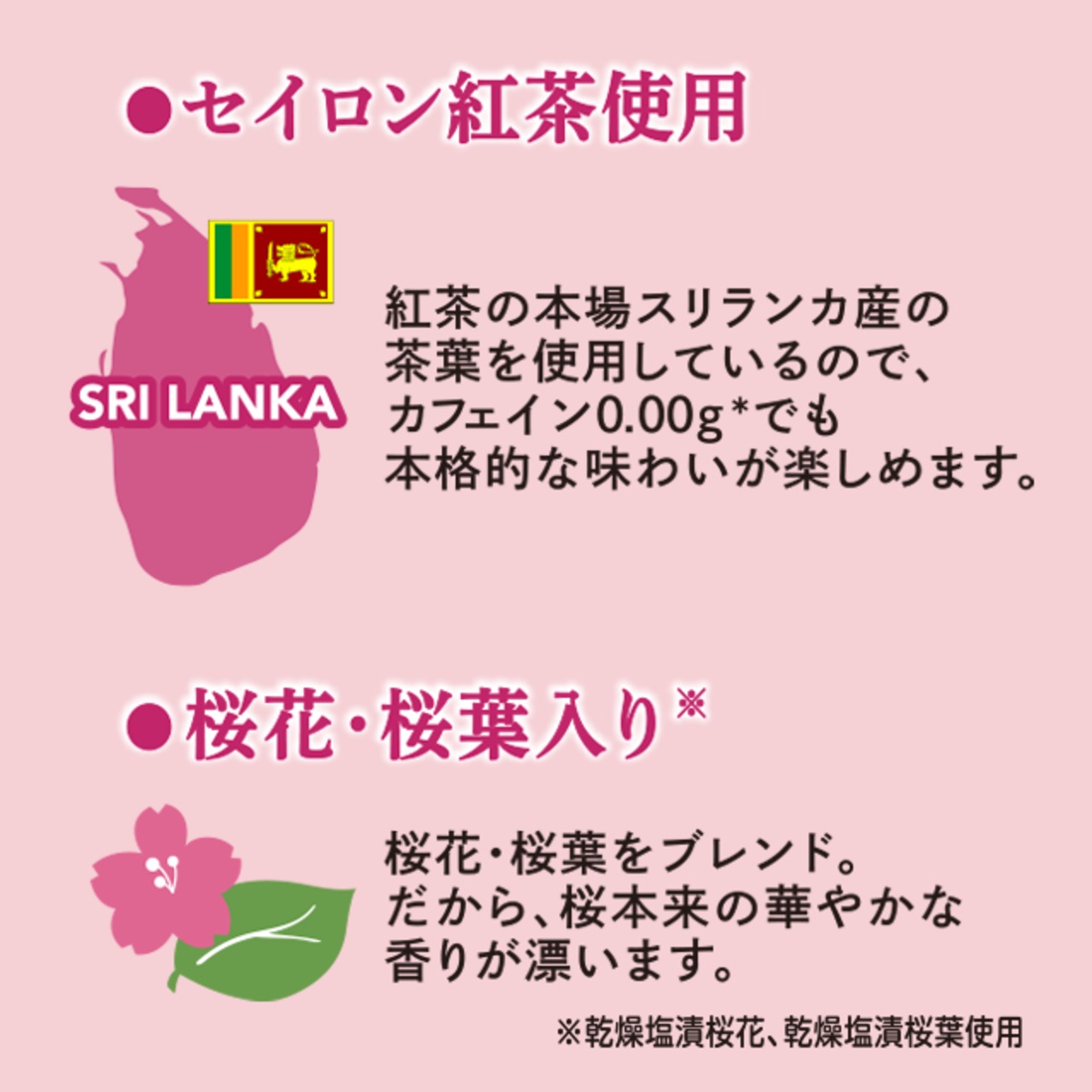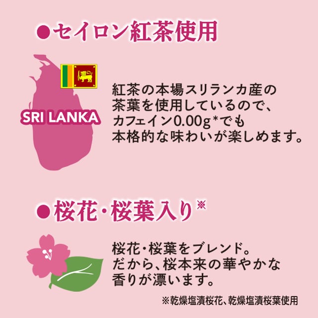 紅茶(スリランカ)、乾燥塩漬桜葉(桜葉、食塩)、乾燥塩漬桜花(桜花、食塩)、桜葉エキス(塩漬桜葉)/酒精、焼ミョウバン