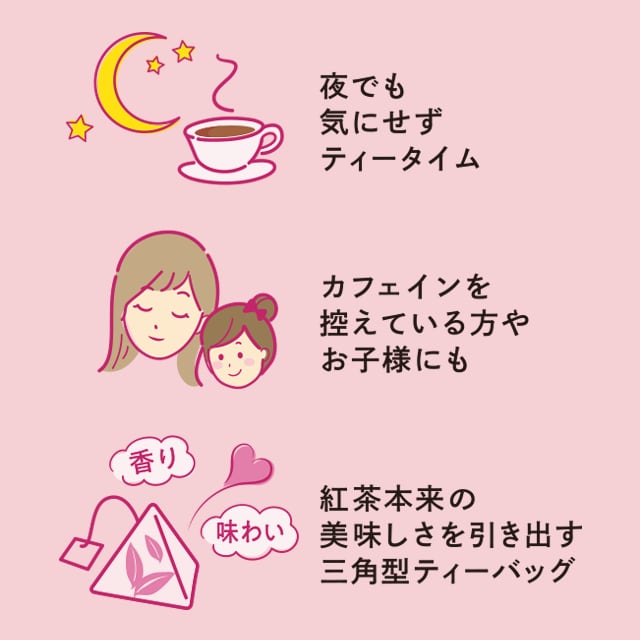 紅茶の本場スリランカ産の茶葉を使用しているので、カフェイン0.00g*でも本格的な味わいです。夜でも気にせずティータイムを楽しみたい方、カフェインを控えている方やお子様にも。