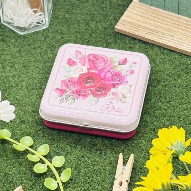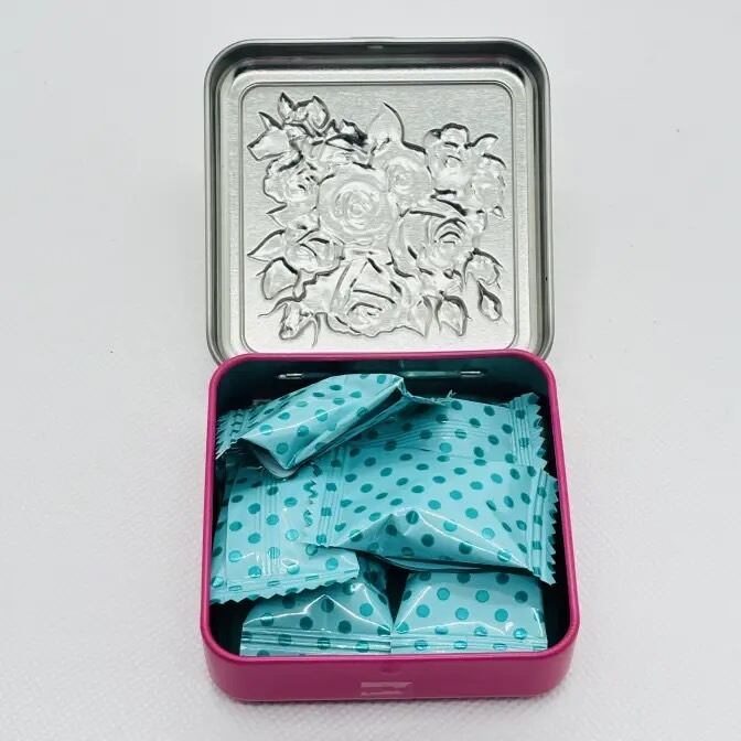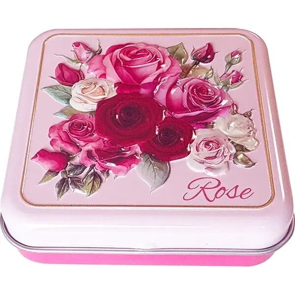 バラ柄のミニ缶です。中にはストロベリー風味のキャンディが6個入っています。