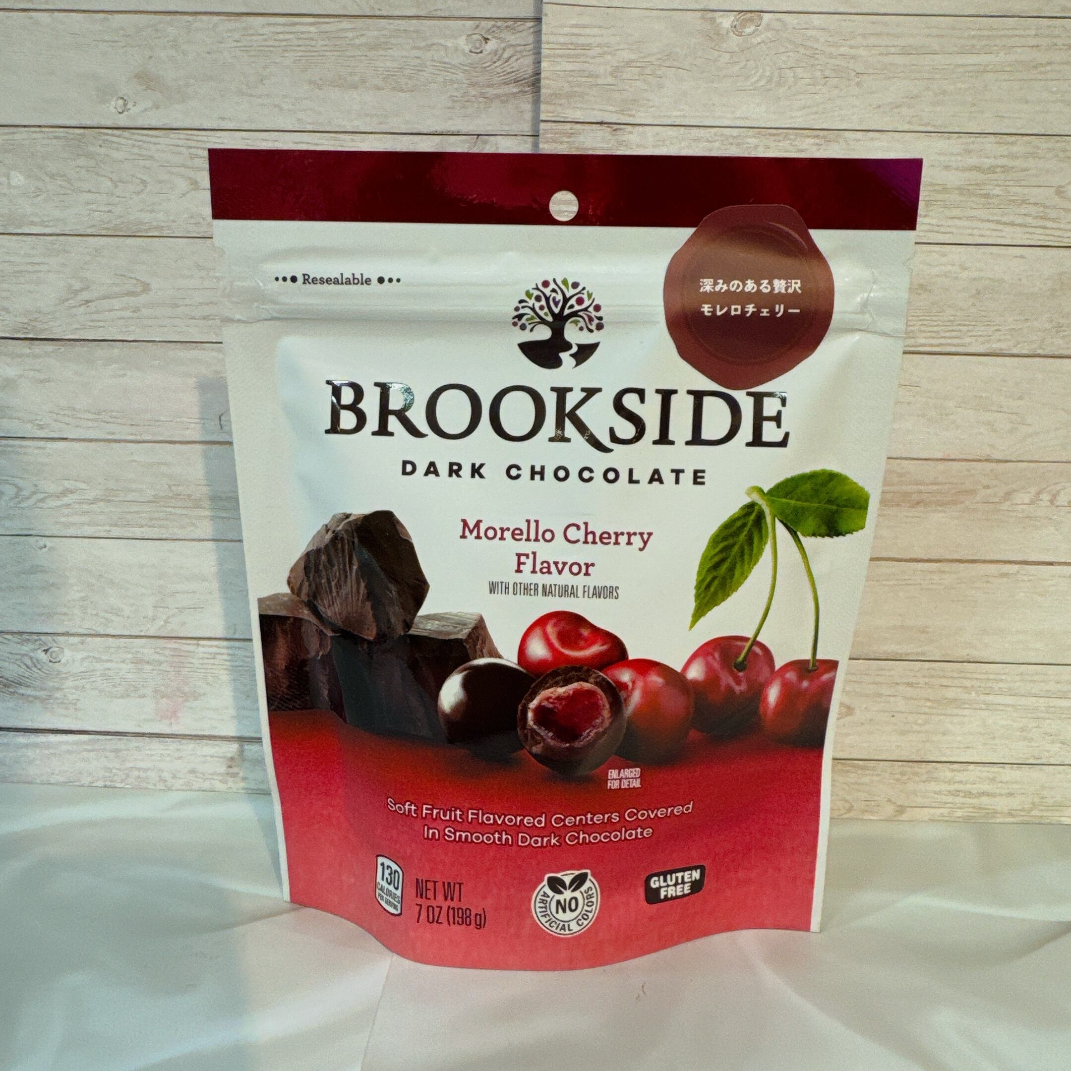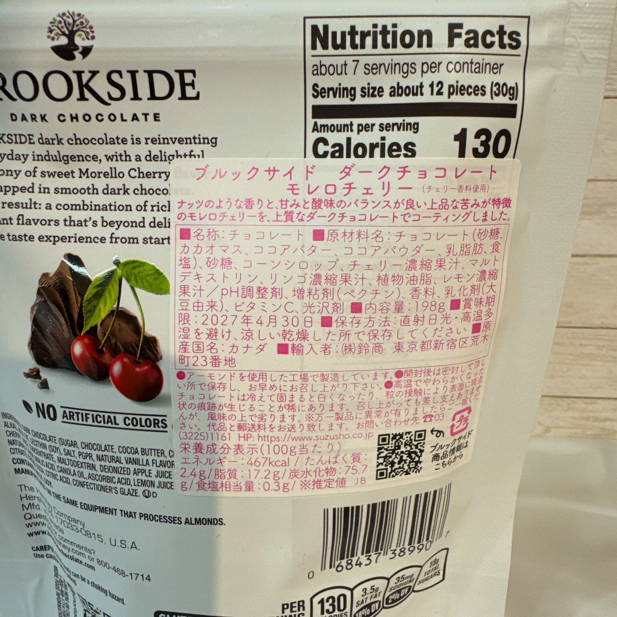 ブルックサイドのダークチョコレート モレロチェリーは、甘酸っぱいチェリー果汁を凝縮したソフトなセンターを、コクのある甘さ控えめのダークチョコレートで包んだカナダ発のチョコ菓子。