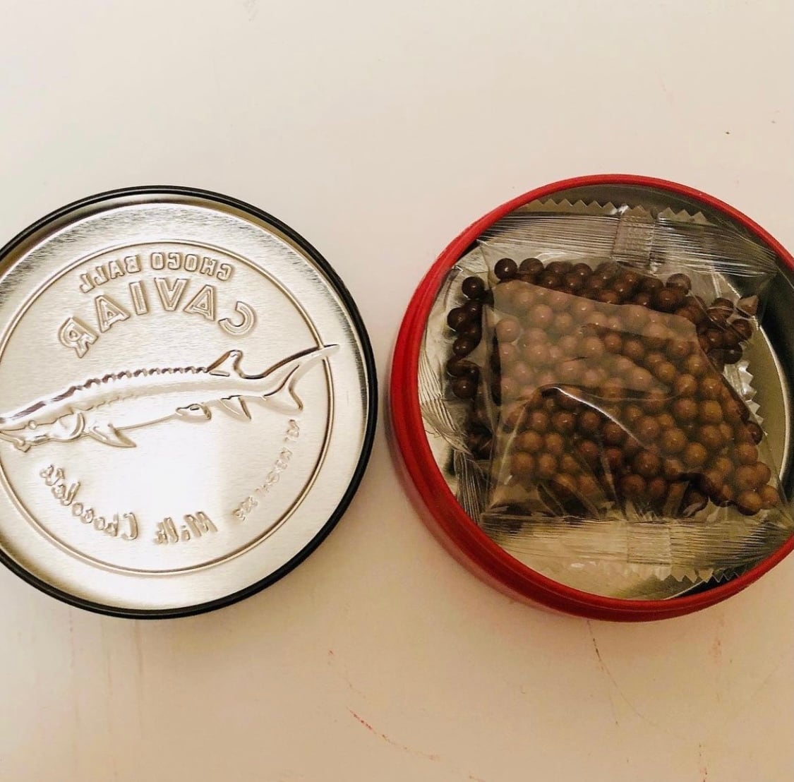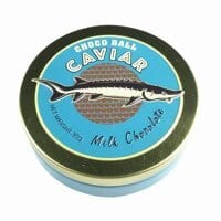 本物そっくりなキャビア缶の中に、キャビアをイメージしたボールチョコ2袋が入っています。