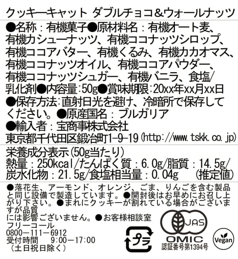 ■原材料:有機オート麦、有機カシューナッツ、有機ココナッツシロップ、有機ココアバター、有機くるみ、有機カカオマス、有機ココナッツオイル、有機ココアパウダー、有機ココナッツシュガー、有機バニラ、食塩/乳化剤