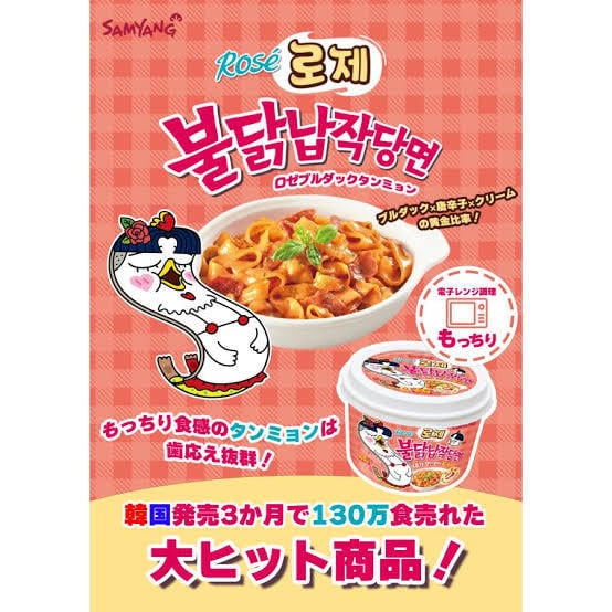 発売から3ヶ月で130万個の売上を達成した大ヒット商品! K-FOODの「ロゼ味」を牽引するクリーミーな味わいにあとからくるブルダックらしい辛さと、中国発祥の極太もちもち春雨(=タンミョン)の歯ごたえがあるモチモチ食感がやみつきになる一品です。