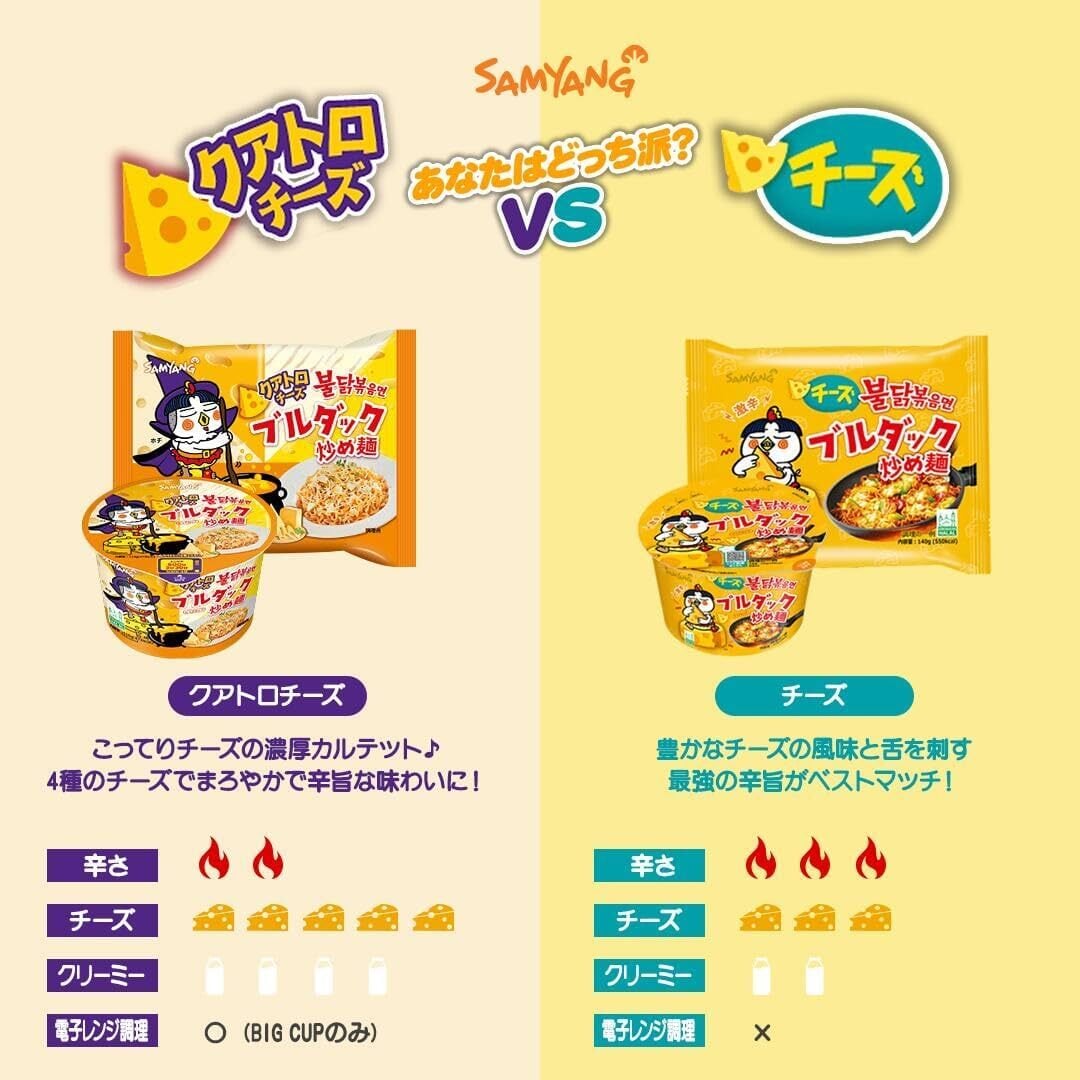 こっくりチーズの濃厚カルテット♪ 粉末に4種のチーズが20%以上含まれ、濃厚で深みのあるチーズの味わいと辛さが調和されたブルダック炒め麺クリーミーラインの一品!