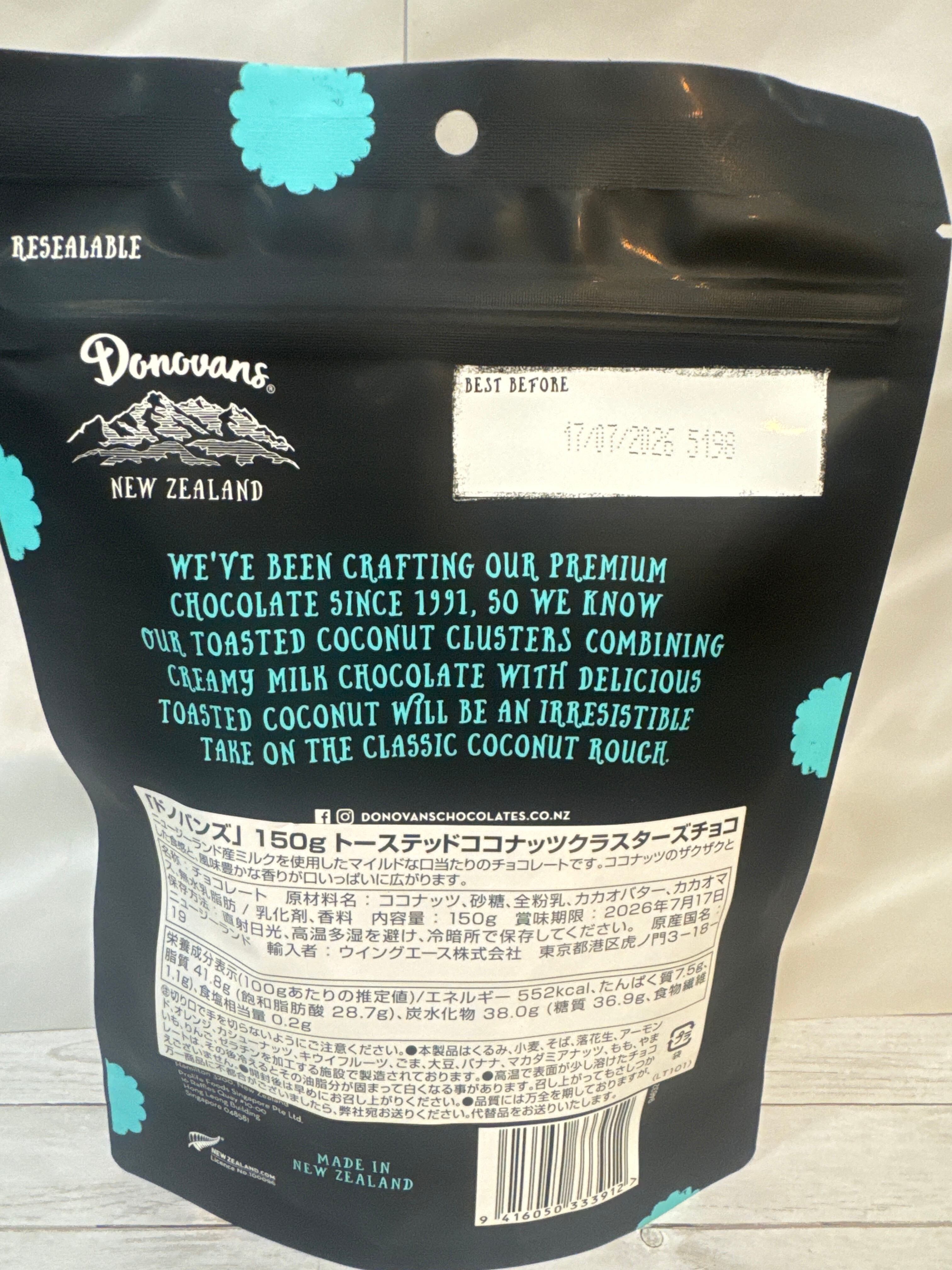 ニュージーランドの「Donovans Chocolates」のチョコレートクラスターが届きました。チョコレートを固めた、ざっくりとした食べ応えのあるチョコレートです。(ホーキーポーキー)ニュージーランドの定番、アイスクリームにキャラメルの粒を入れたフレーバーです。(トーステッドココナッツ)ココナッツの風味豊かな香りが口いっぱいに広がります。(ソルトキャラメルプレッツェル)塩キャラメルとプレッツェルのザクザク感がやみつきになります。