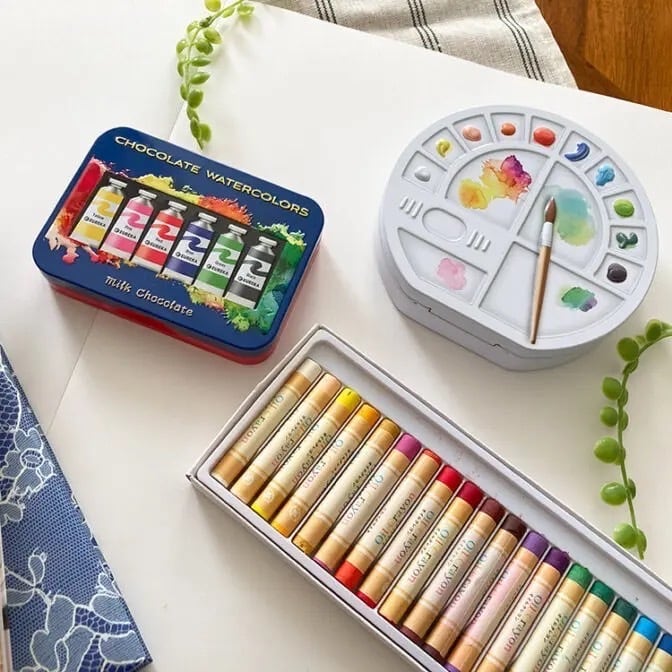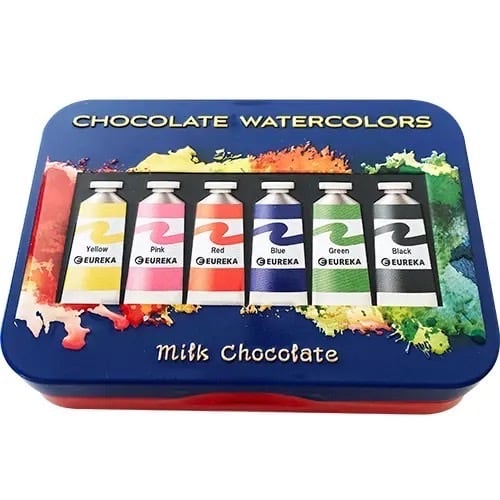 絵の具のような形の缶にチョコクランチが3個入っています。
