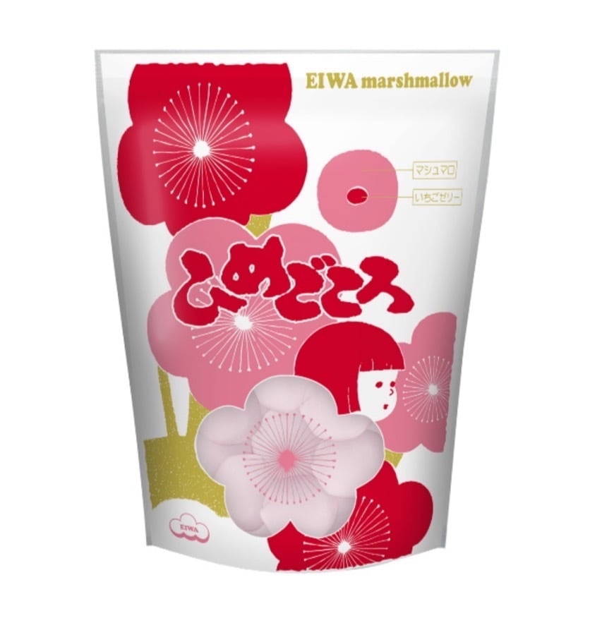 春を彩るスタンドパック入りのいちごマシュマロです。 梅の花をモチーフに春の訪れを表現したデザインと商品名が相まって、発売以来45年以上もの間、幅広く皆様からご愛顧を頂いている当社の伝統商品です。