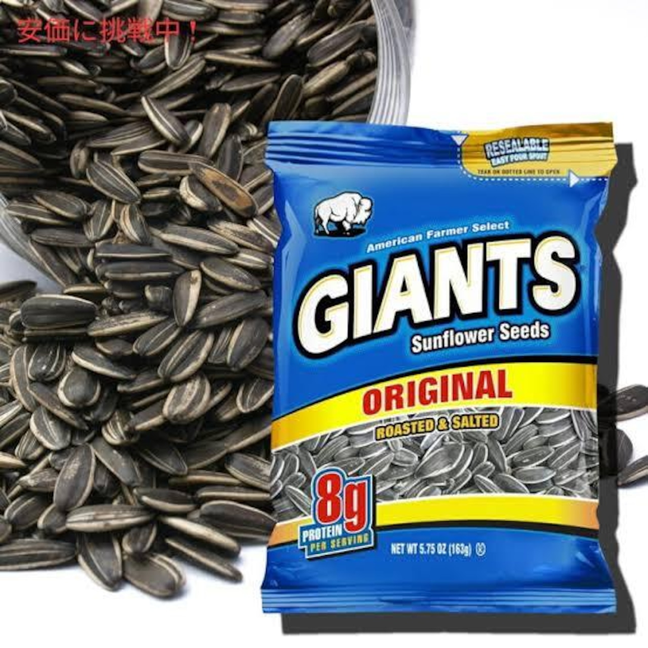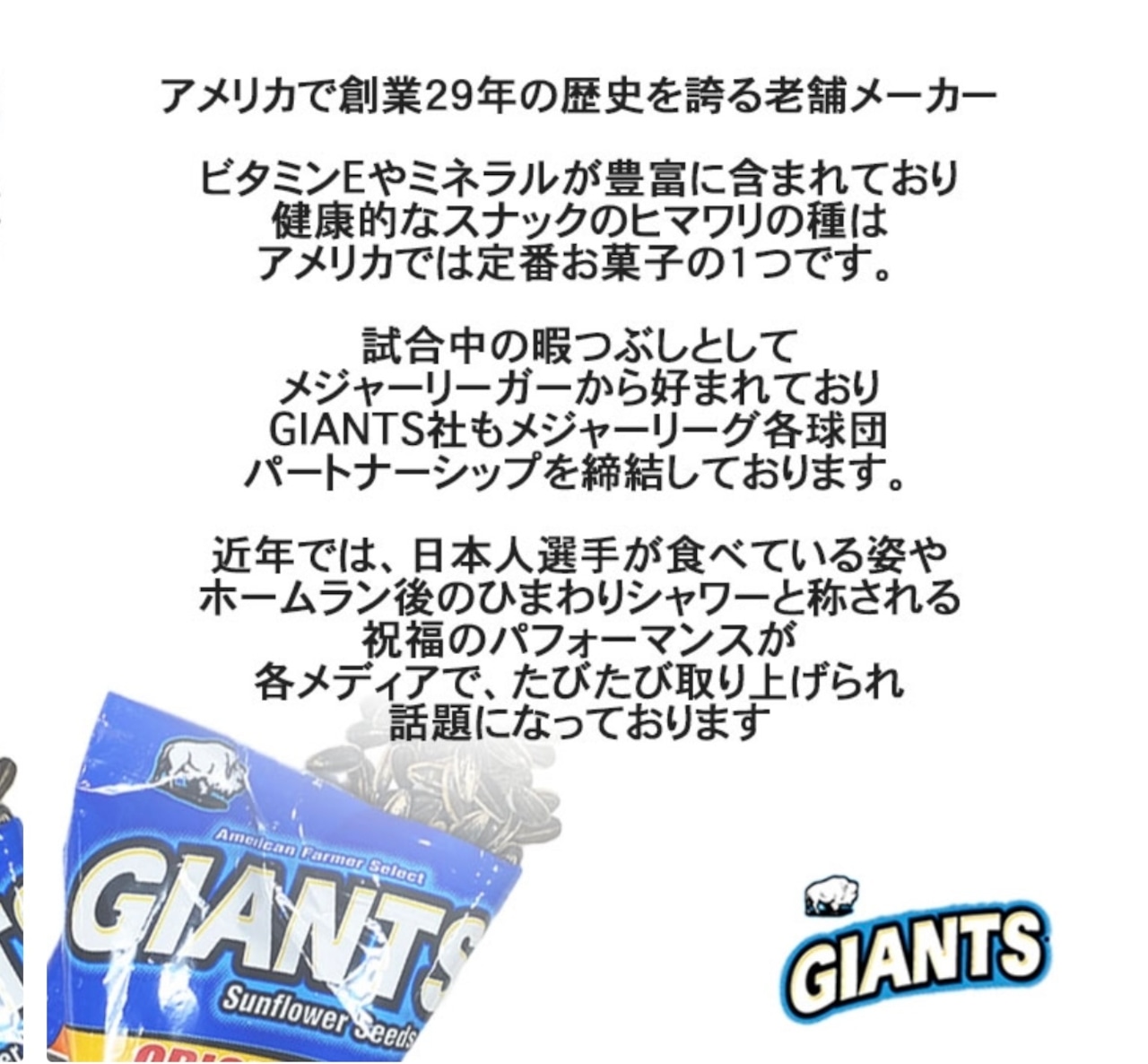 アメリカで創業29年の歴史を誇る老舗メーカー ビタミンEやミネラルが豊富に含まれており 健康的なスナックのヒマワリの種は アメリカでは定番お菓子の1つです。 試合中の暇つぶしとして メジャーリーガーから好まれており GIANTS社もメジャーリーグ各球団 パートナーシップを締結しております。 近年では、日本人選手が食べている姿や ホームラン後のひまわりシャワーと称される 祝福のパフォーマンスが 各メディアで、たびたび取り上げられ 話題になっております