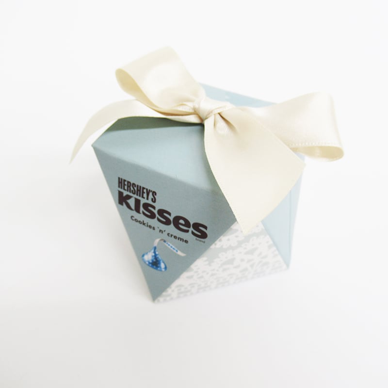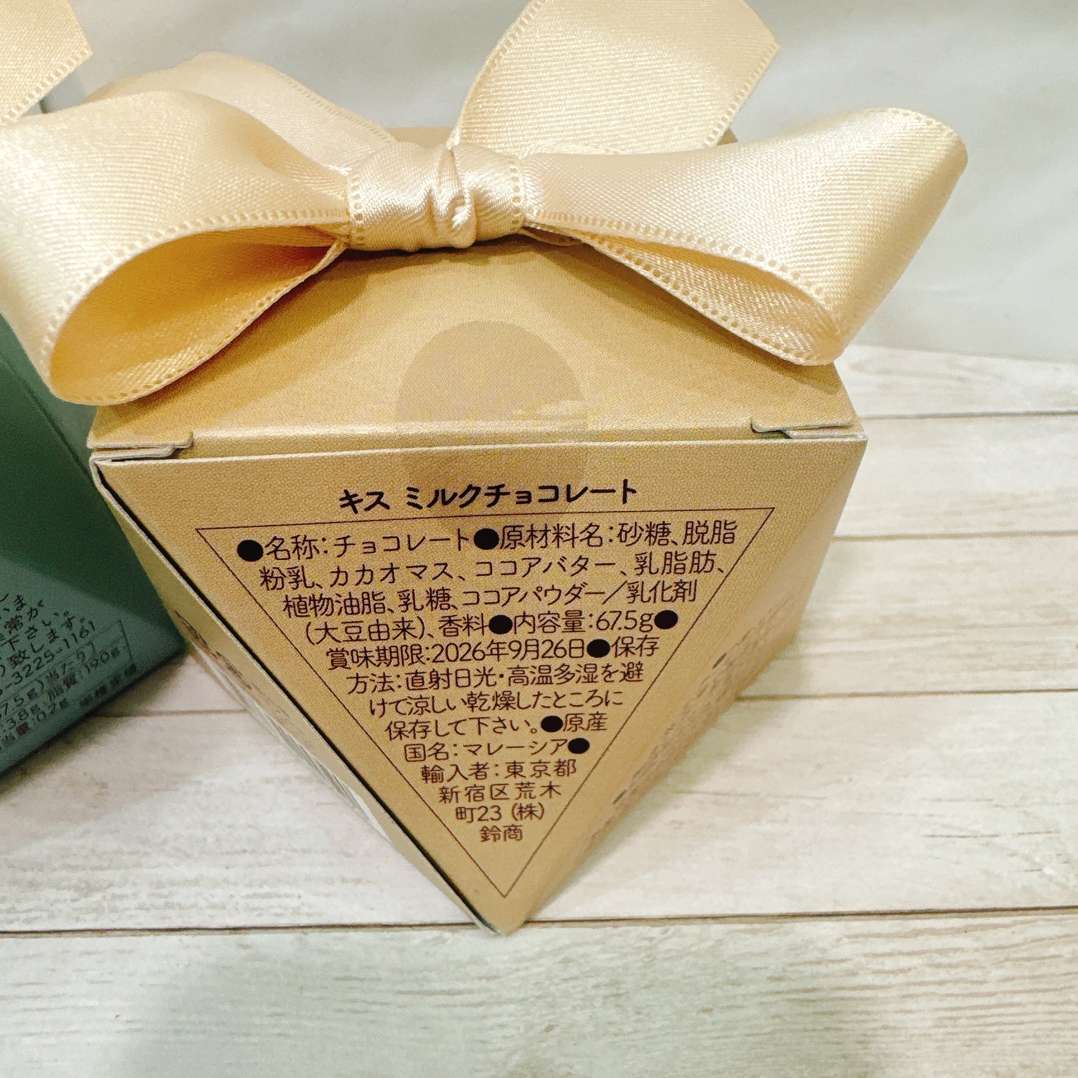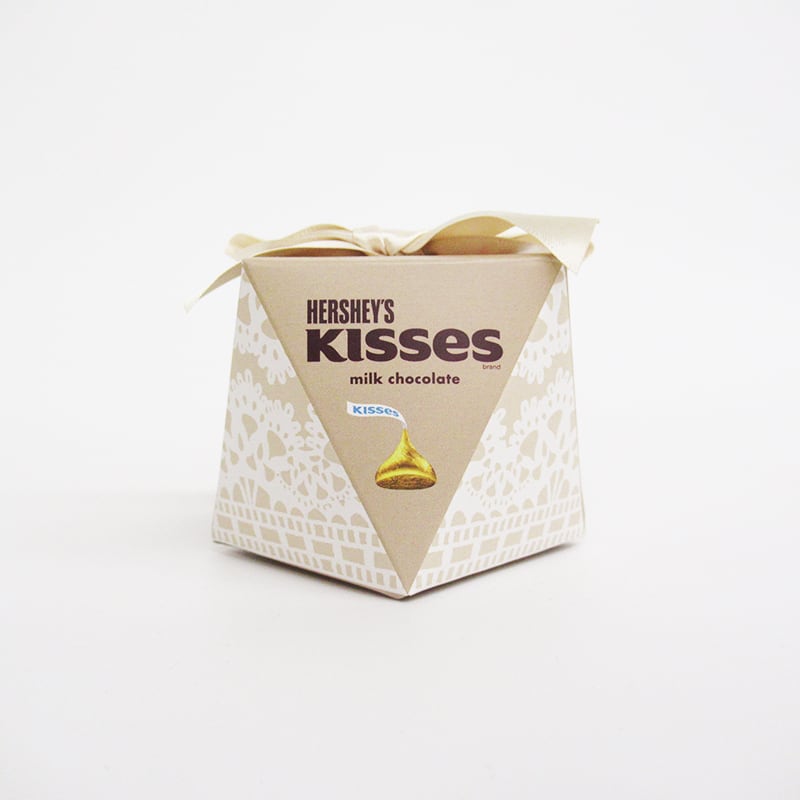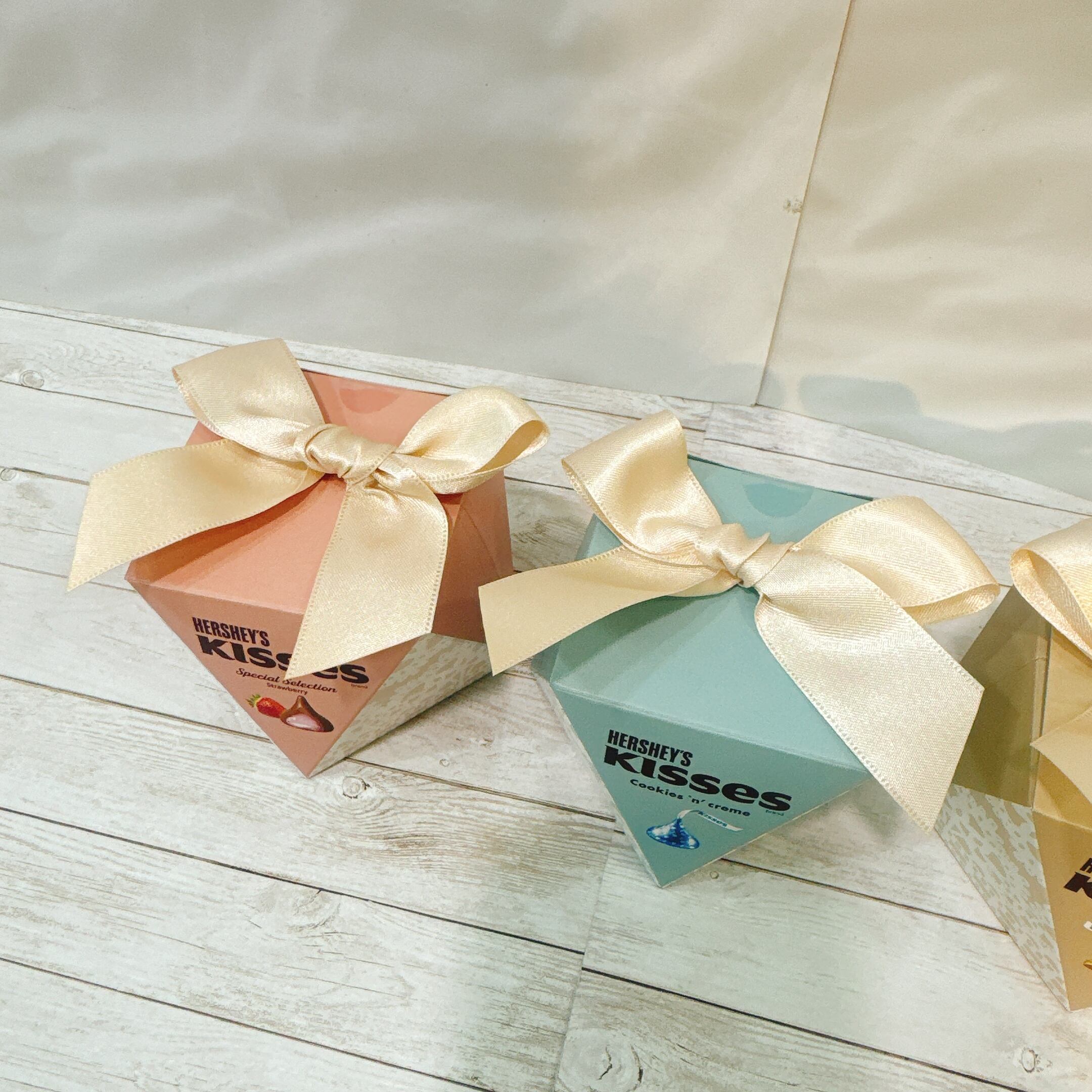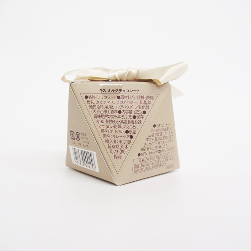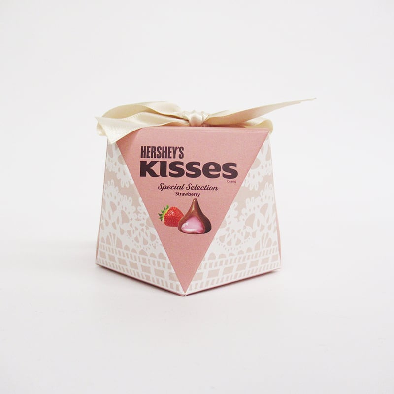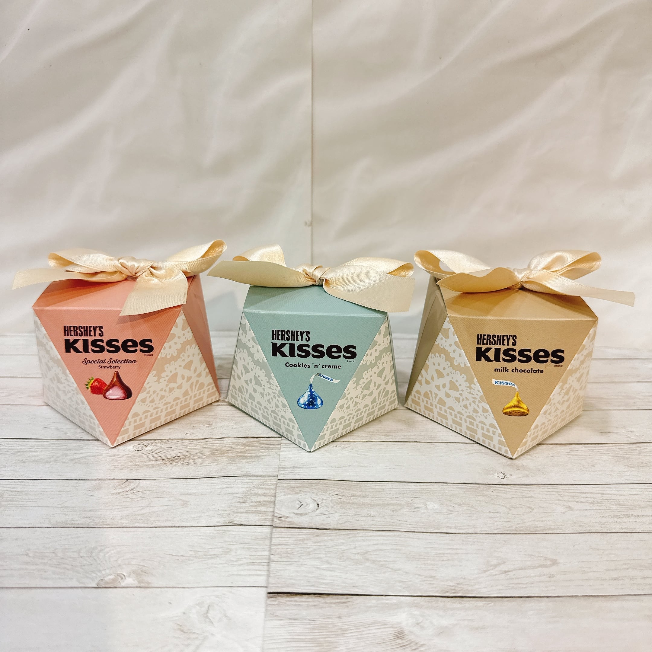 可愛い形のクリスタルボックスに定番のキスミルクチョコレートを詰めました。大人可愛いデザインにリボン付き。